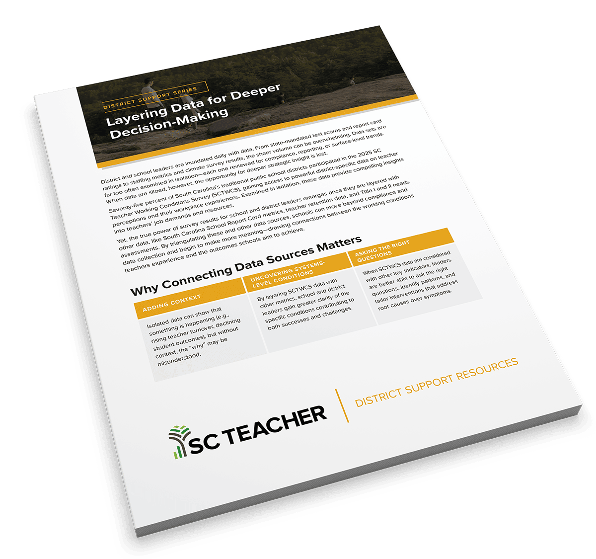 This addition to our District Support Series helps guide strategic planning teams through layering existing data sets, such as SC Teacher Working Conditions Survey data, SC School Report Card metrics, and more. By triangulating findings from a variety of meaningful sources, district leaders can gain more insight, supporting the outcomes districts and schools aim to achieve.